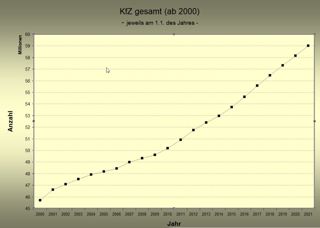 Habe mir mal wieder den deutschen KfZ-Bestand angesehen, in der Erwartung, dass im Corona-Jahr 2020 wenigstens eine kleine Abflachung des Zuwachses zu verzeichnen wäre. Pustekuchen. Wie in den beiden Vorjahren wuchs der KfZ-Bestand 2020 um 1,5% (+ 862.000). Zwar erhöhte sich der PKW-Bestand mit + 533.000 in 2020 etwas langsamer als in 2019 (+ 620.000), aber das wurde durch die starken Anstiege bei LKW und Motorrädern vollständig wettgemacht. Unter den PKW nahmen SUVs und Geländewagen sowie Wohnmobile wieder weit überdurchschnittlich zu. Der KfZ-Bestand in Deutschland belief sich am 1.1.2021 auf wahnwitzige 59,02 Mio. Fahrzeuge. Unten die Entwicklung des Bestandes ab dem Jahr 2000.