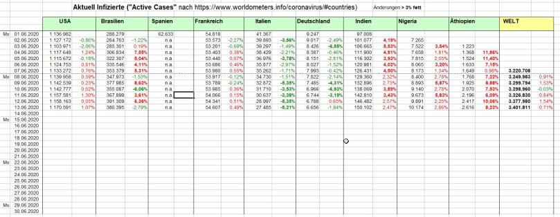 Betrachtet werden die USA, das bevölkerungsreichste Land Südamerikas, Brasilien, 4 große europäische Länder, das riesige Indien und 2 große Länder Afrikas, wo die Seuche gewissermaßen noch in den Kinderschuhen steckt. Neben der absoluten Zahl aktuell Infizierter an einem bestimmten Tag wird in einer zweiten Spalte die prozentuale Veränderung zum Vortag angegeben. Abnehmende Zahlen werden in grün dargestellt, zunehmende in rot; Veränderungen von mehr als 3% sind fett formatiert, was die Lesbarkeit der Tabelle erhöhen soll.